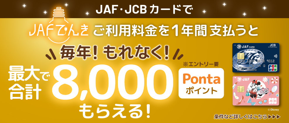 JAF・JCBカードでJAFでんきの利用料金を1年間ごとの継続支払いで、Pontaポイントを最大で年間合計8,000ポイント進呈!