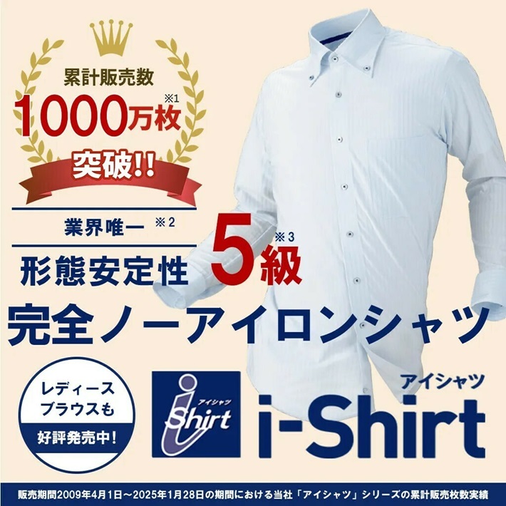 i-Shirt(アイシャツ)は「洗ったらアイロン掛け」というワイシャツの常識を変える完全ノーアイロンシャツです。夜洗濯をして翌朝には着ることができる「超速乾機能」、ストレスフリーな着心地を実現する「ストレッチ機能」など、着用からお手入れまでの快適性を追求。体の動きに合わせて生地が伸び縮みする高いストレッチ性が特徴で、動作時の負荷が少なく着用ストレスも軽減。完全ノーアイロン、ストレッチ、超速乾の機能で快適な着心地やイージーケア性に優れているワイシャツです。