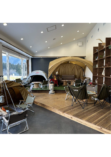 店内には、キャンプ気分が味わえるスペースがあります。メタセコイア並木と一緒に…
