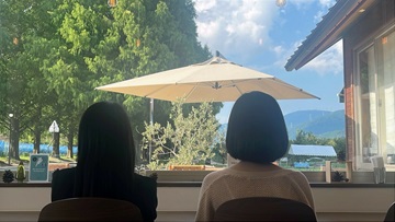 店内からメタセコイア並木を背景に写真が撮れます。フードやドリンクはもちろんのこと、記念写真にもぴったりです。