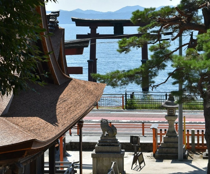 ★おすすめ写真スポット:社務所前展望台「藍湖白鬚台(おうみしらひげだい)」からの湖中大鳥居の撮影