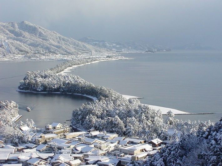 幅約20~170m・全長約3.6kmの砂州に6,000本以上の松が茂っている珍しい地形で、その形が天に架かる橋のように見えることから「天橋立」の名が付きました。