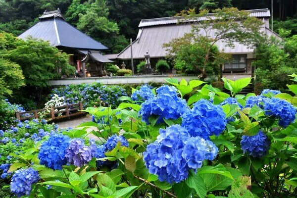 初夏には境内一帯が色とりどりのアジサイに包まれ、毎年多くの参拝者や観光客が訪れます。