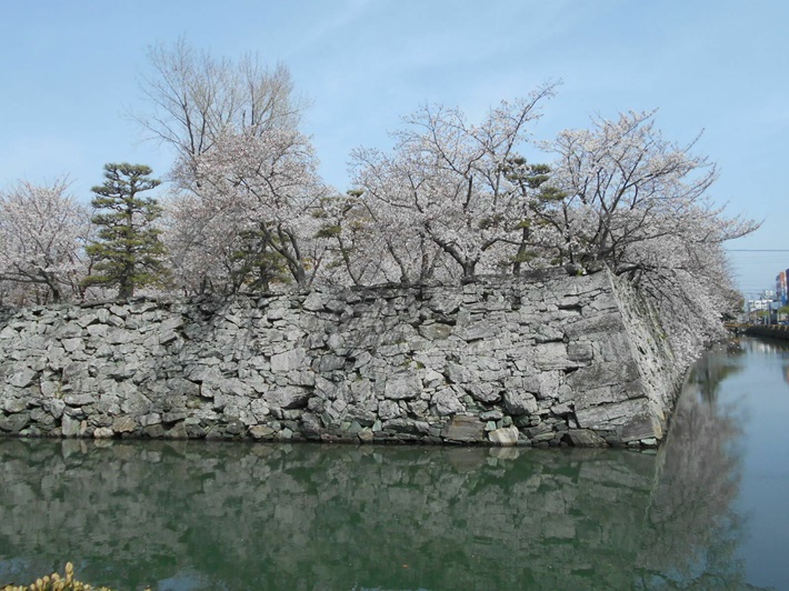 徳島城跡のお堀に咲く桜。水面に映る桜の風景を楽しめます。