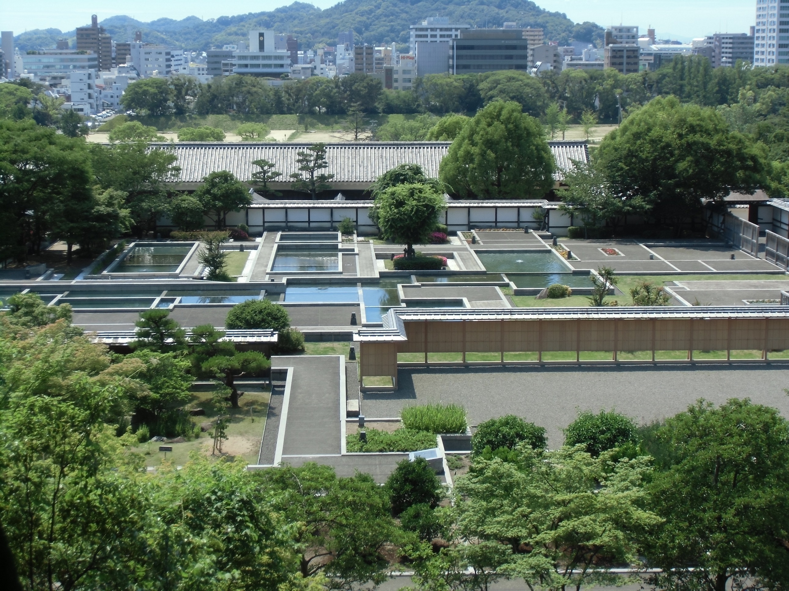 松山城二之丸跡の敷地に整備された史跡庭園で、古い絵図や発掘調査に基づいて松山藩主の邸宅跡が復元されています。